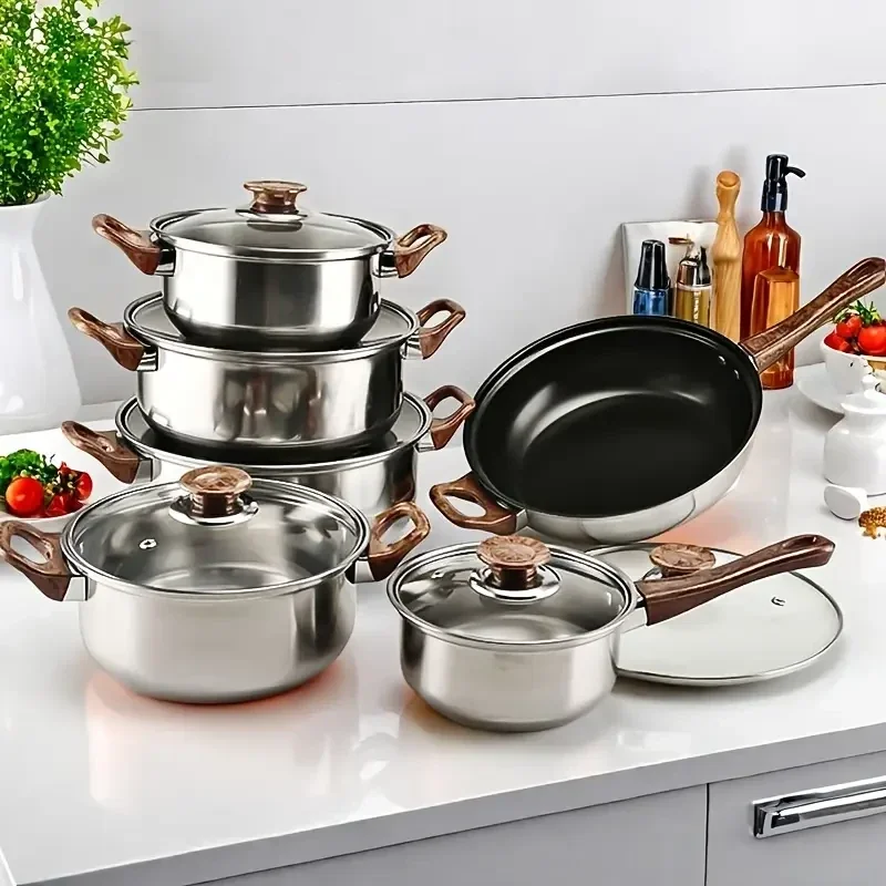 ed 12pcs Stainless Steel Cookware Set, Non-stick Cookware Set, Heat-resistant, Frying Pan, Saucepan, Stew Pot, Multifunctional, Stylish, Durable, Suitable For All Stoves