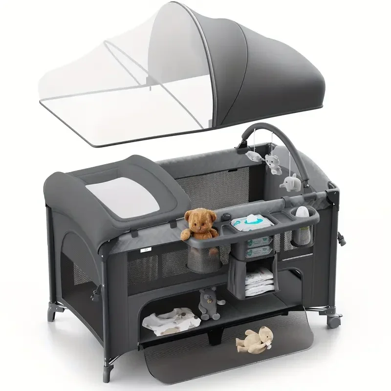 4 In 1 Baby Bassinet, Bedside Crib, Diaper Changer, Portable Newborn Nursery Center Pack And Play Baby Crib- Comes With Mattress, Mosquito Net, Bottom Storage, Toy Bar And Travel Bag, For Newborn To Toddles