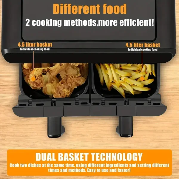 9L Family-Size Double Air Fryer Oven with 2 x 4.5L Independent Baskets - Dual Zone, Healthy Oil-Free Cooking, 10 Presets, Digital LED Display, 1800W Power - Includes Cookbook and Easy Recipe Guidance